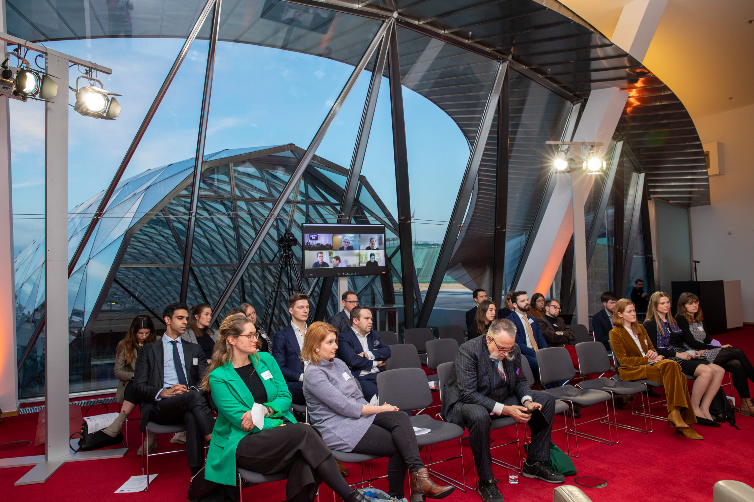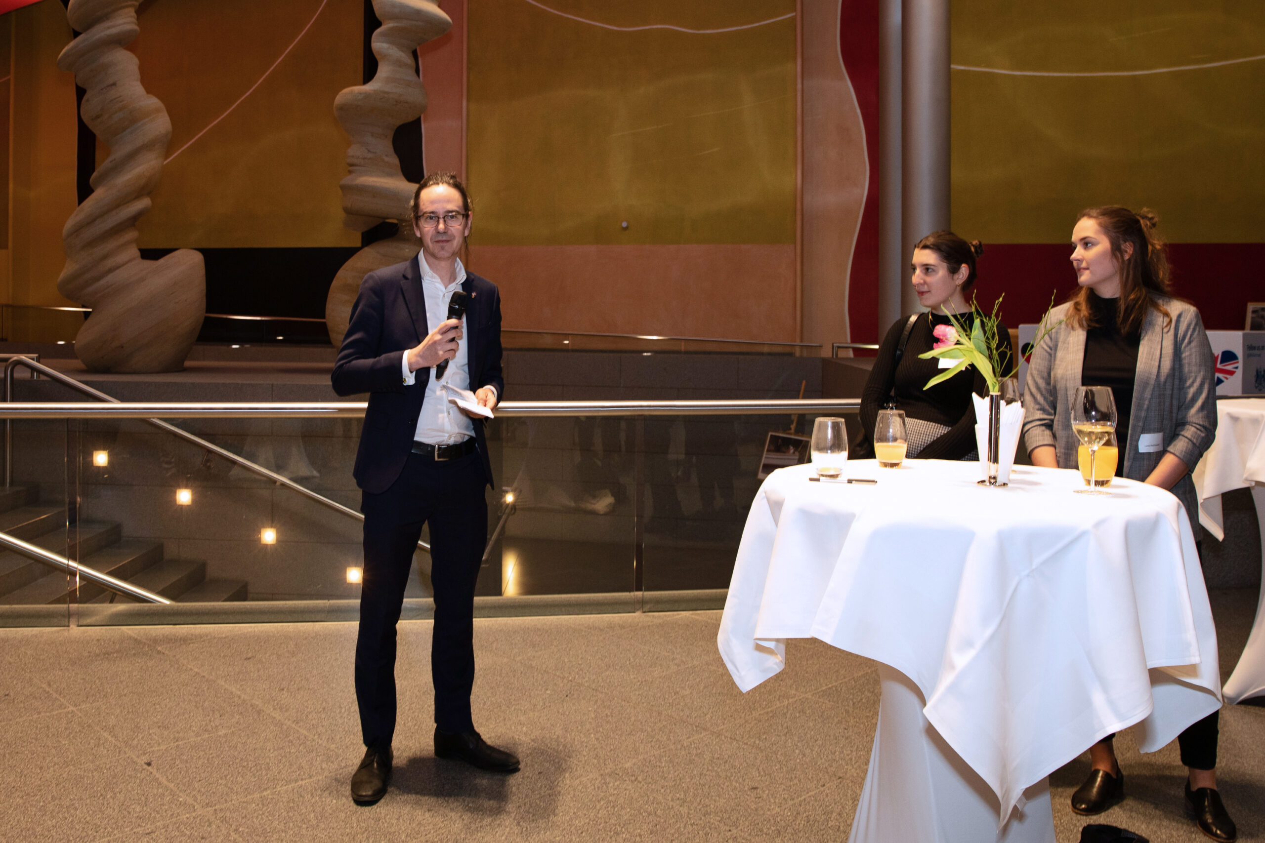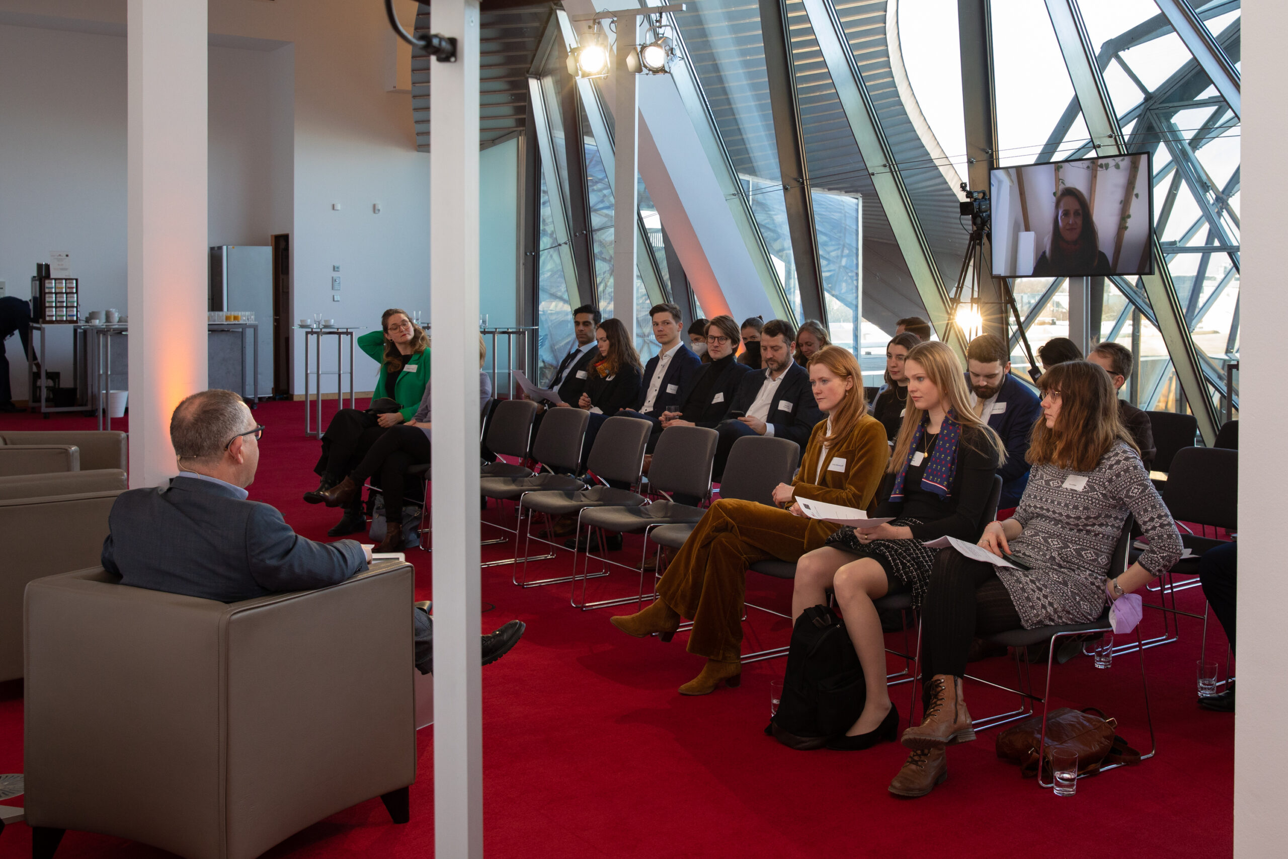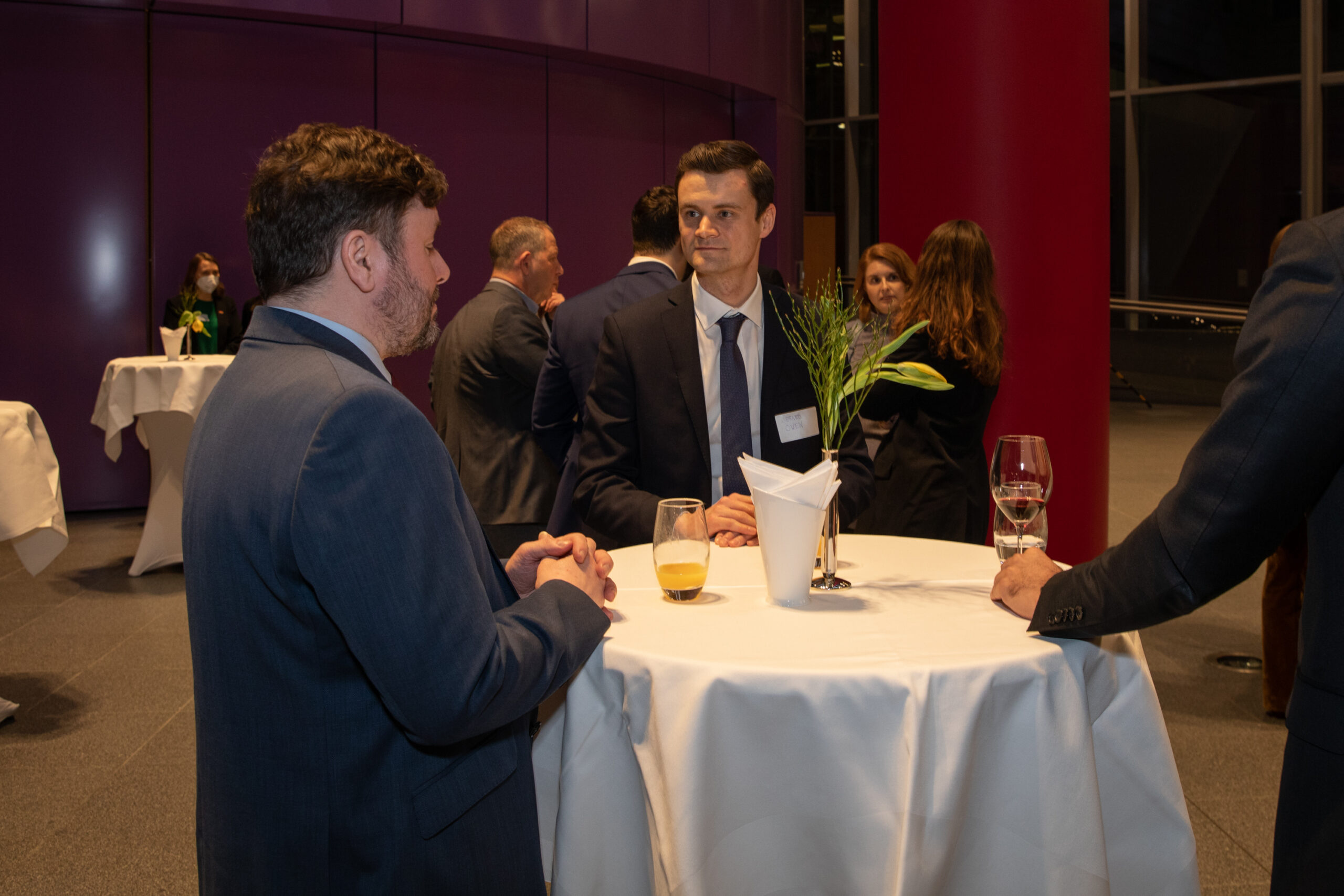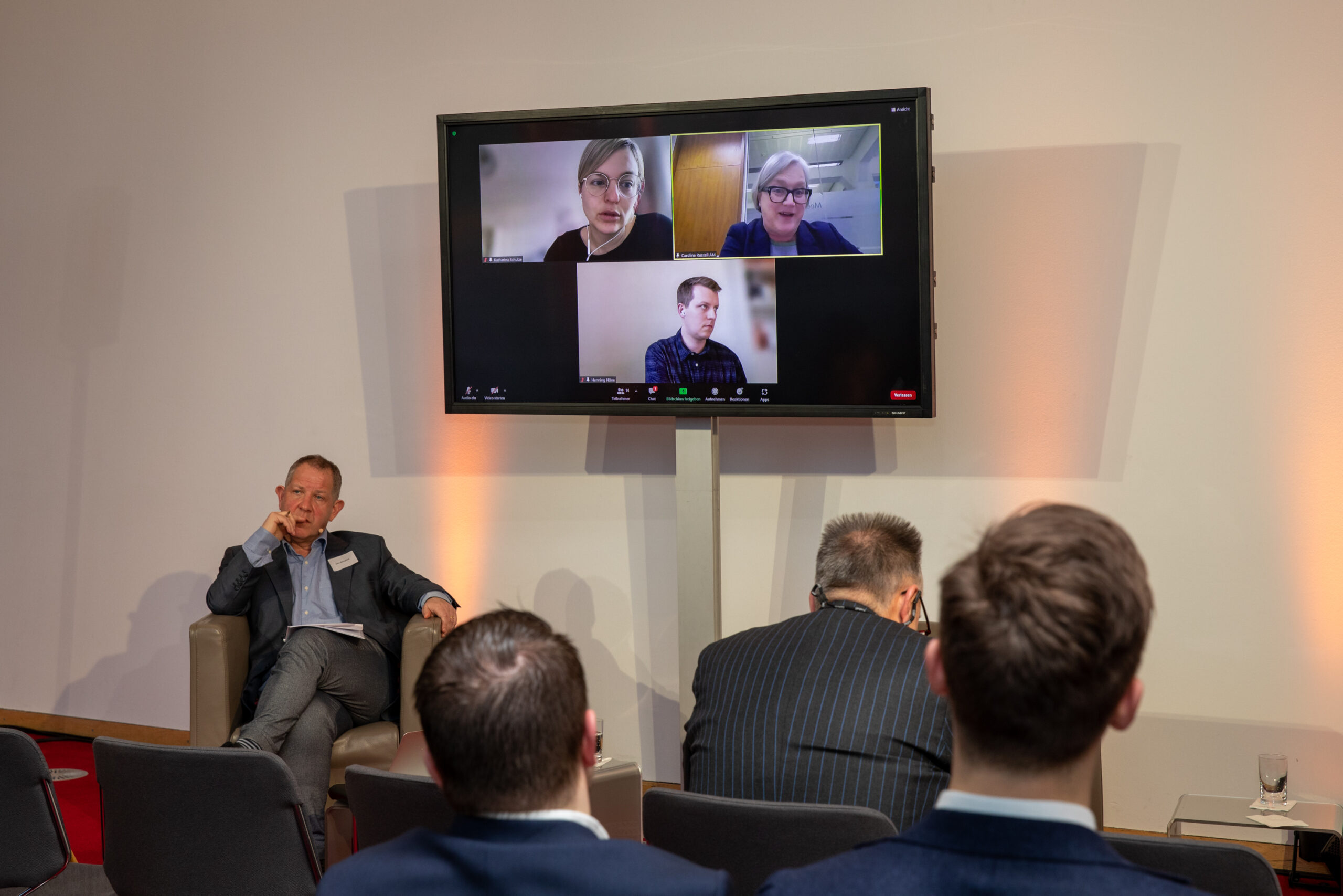 The event began in the Sky Lobby at Axica and participants were welcomed by Thomas Matussek, former ambassador to the United Kingdom and chairman of the Deutsch-Britische Gesellschaft e.V., and Julia Rawlins of the Young Königswinter Alumni e.V.. Journalist, author and executive director at Chatham House John Kampfner, who also chaired the Young Königswinter Conference 2022, chaired the panels and discussions.